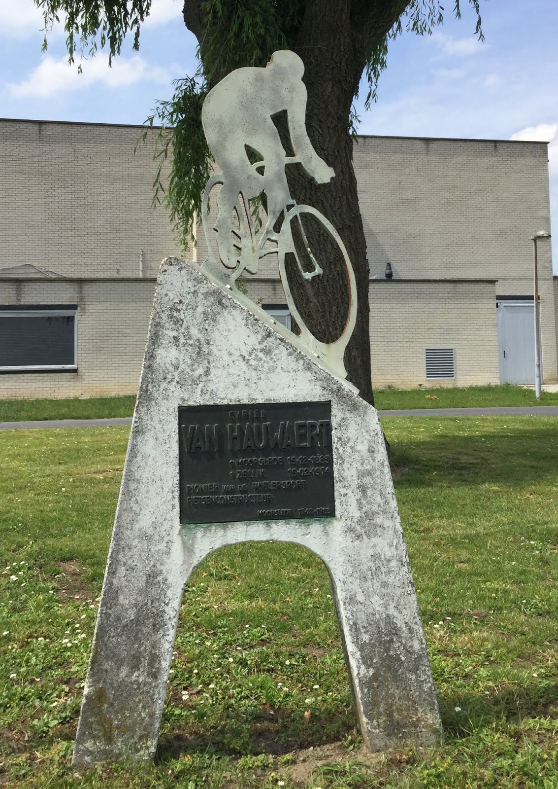 the city of Izegem not far away housing young up-and-coming American racers. In fromt of the sports complex in Moorslede was a statue of Cyriel Van Hauwaert, an early day cyclist who won two of the Five Monuments in 1908–Paris-Roubaix and Milan-San Remo—and finished fourth in The Tour in 1910.